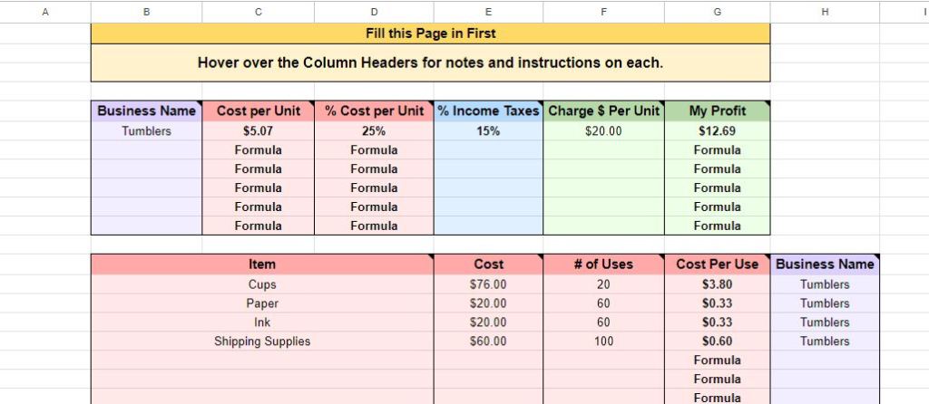 Next we have the expenses tab. This tab is where we do the boring part and then we get to move on with our lives. The top table is for the essential information: Business Name, Taxes, and Expenses for the side hustles that regularly have expenses not limited to website fees. The Business Name is most important, because this is pretty much what the formulas hinge on. Even if the Business does not have expenses, you still need to enter the name and Tax percent up top. If you don’t want to set aside money for taxes, you can forgo this tab, but I wouldn’t recommend ignoring taxes (usually 15-30% is sufficient to set aside). I filled in an example shown below.