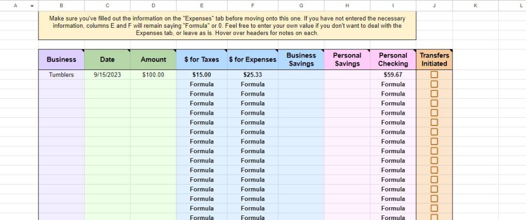 The last tab is the fun part! Entering what you received and moving it into different accounts. The Taxes and Expenses will be calculated off of the information entered on the “Step 1: Expenses” tab, hinging on the Business name. If you don’t want to use the amounts calculated, just type in your own amount instead. The Personal Checking column is also a formula and will show you how much money you have left to distribute across the categories if you’d like. Once you’re satisfied where its all set to go you can schedule the money transfers and checkoff the orange box at the end.