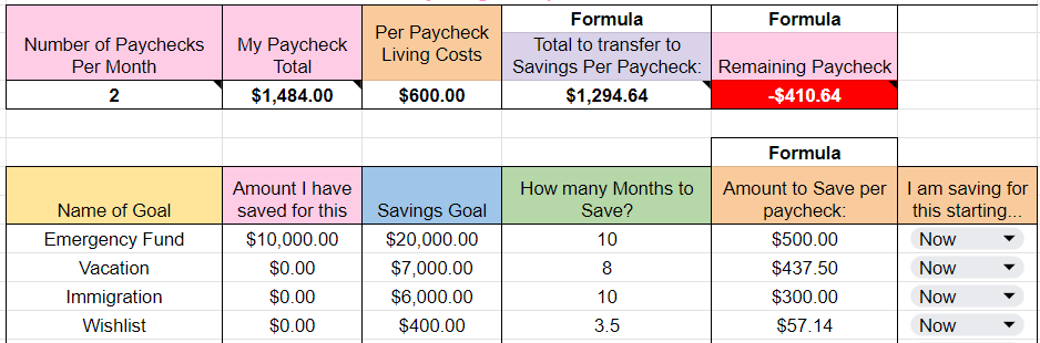 The last thing we need to do is figure out how much we need to save per paycheck or per month to achieve our financial goals. Of course, I have a template for this, but doing it by hand is just as easy.