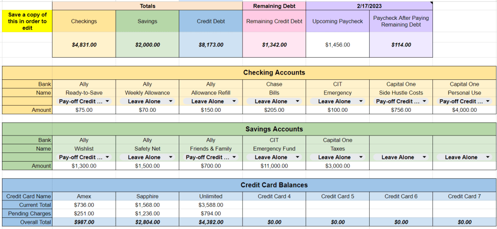 While this template gives me visibility on all the money I have access to, I don’t necessarily want to use all of it to payoff the credit card debt. I specifically want to leave myself with enough cash to cover my living expenses… otherwise I end up in a credit debt loop that seemingly has no end. So, using the information you have, decide how you will payoff your credit card balance. How many paychecks will it take? Can we cut any expenses until its paid down? Can we return anything we purchased? How are we going to dig ourselves out of this hole? If I don’t have enough in my preferred accounts to payoff the debt, I have no issue dipping into the emergency fund money. As far as I’m concerned, if I have credit card debt the money doesn’t count as savings anyways. Luckily, for my situation right now, my additional income was able to fully cover the debt I accumulated in a mere 3 weeks, and I am back to debit card only!